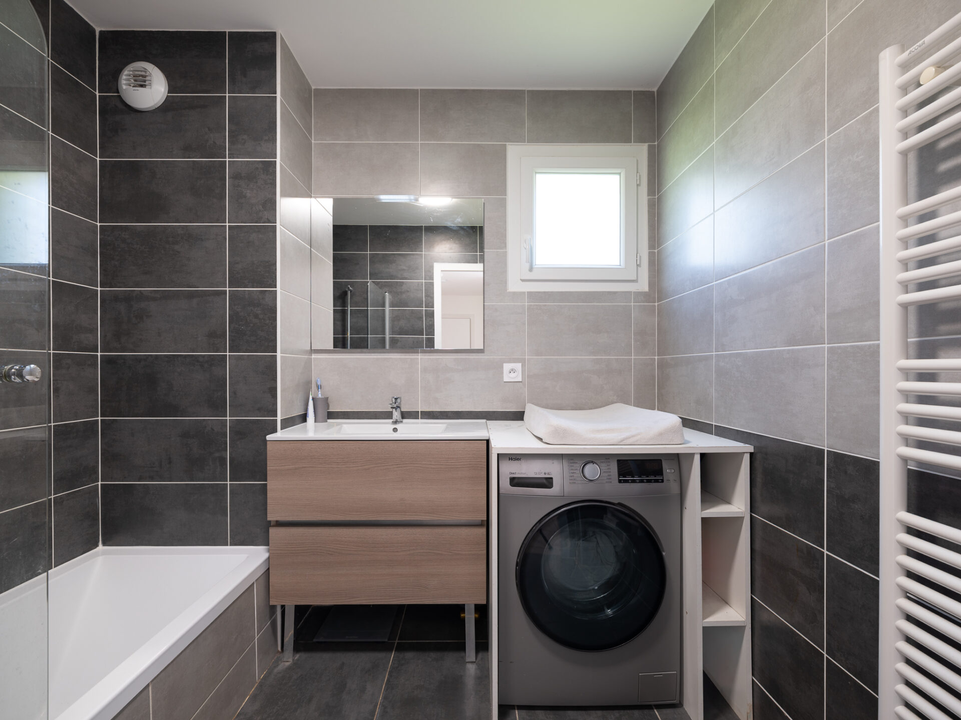 Côté nuit, deux chambres cosy, une salle d’eau contemporaine et un WC suspendu complètent l’ensemble.